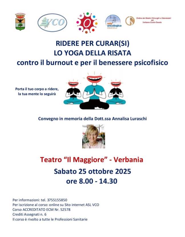 Riceviamo dal Dott. Sergio Montanara e pubblichiamo per opportuna conoscenza la locandina dell'Evento ECM dal titolo "Ridere per curar(si). Lo Yoga della risata contro il burnout e per il benessere psicofisico" che si terrà a Verbania, presso il Teatro "Il Maggiore", sabato 25 ottobre 2025.