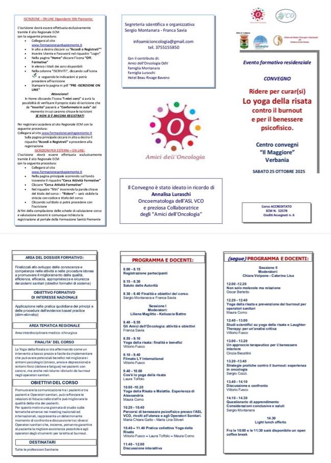 Riceviamo dal Dott. Sergio Montanara e pubblichiamo per opportuna conoscenza la locandina dell'Evento ECM dal titolo "Ridere per curar(si). Lo Yoga della risata contro il burnout e per il benessere psicofisico" che si terrà a Verbania, presso il Teatro "Il Maggiore", sabato 25 ottobre 2025.